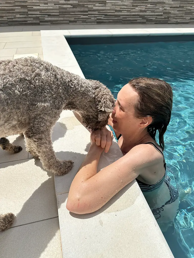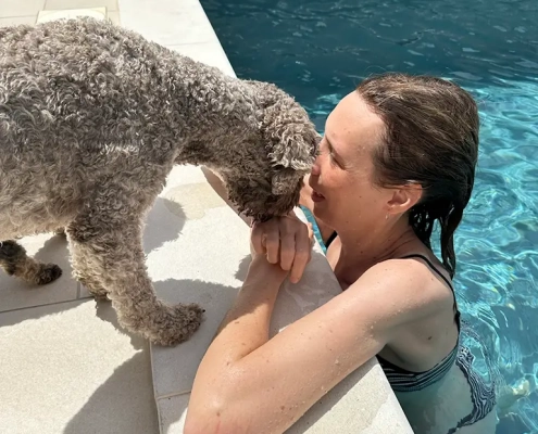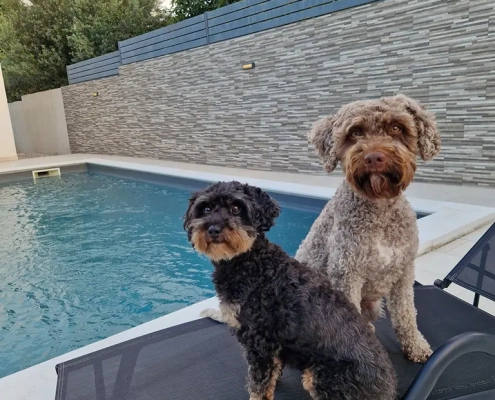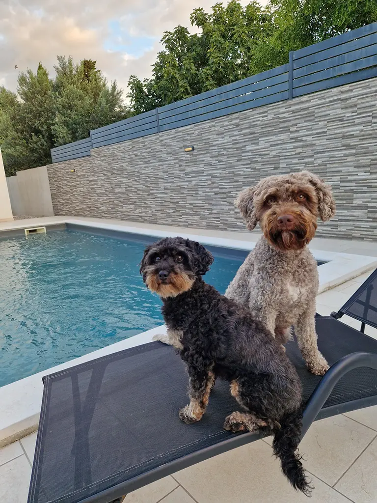 Aber dann: Ankunft in Kroatien. Unser Ferienhaus war ein Traum – eingezäuntes Grundstück, Schatten, Pool. Ich dachte noch: „Jetzt darf ich Heetje dauernd vom Wasser fernhalten.“ Tja, sie ist direkt reingesprungen, erschrak sich dann aber so sehr, dass sie dem Pool von da an lieber fernblieb. Ella? Die fand Wasser eh noch nie so prickelnd.